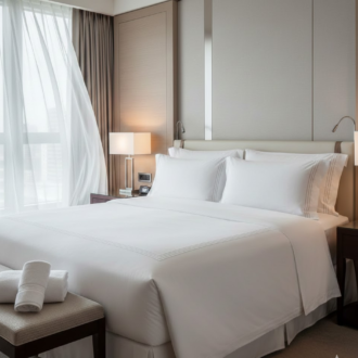 Luxury hotel linens including durable bath linen wholesale, breathable bed sheets, stain-resistant table linen, and cozy top of bed designed for guest comfort and high-traffic durability.